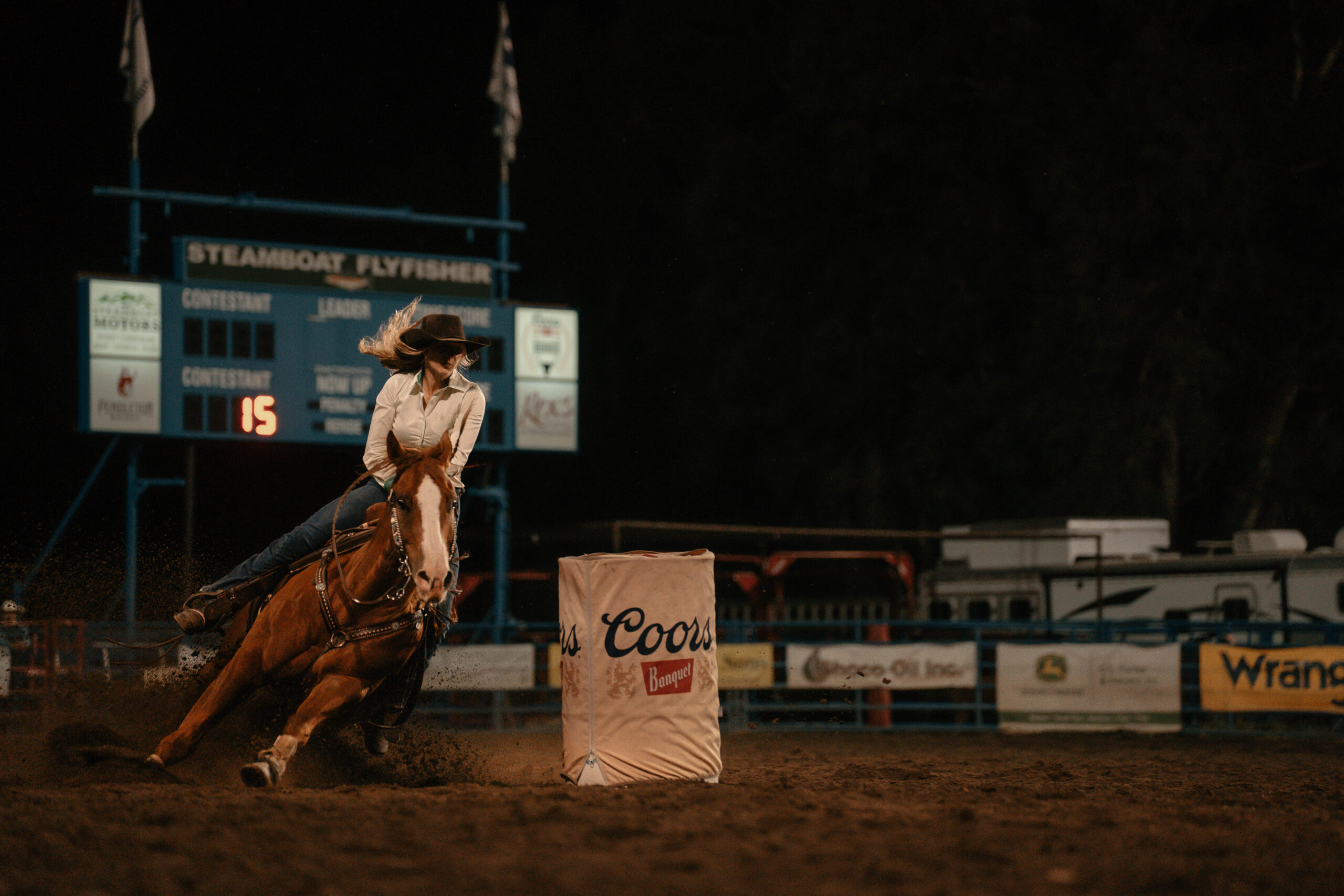 Cowgirls race a cloverleaf pattern around three barrels where the fastest clean time wins, often by just tenths or hundredths of a second.
